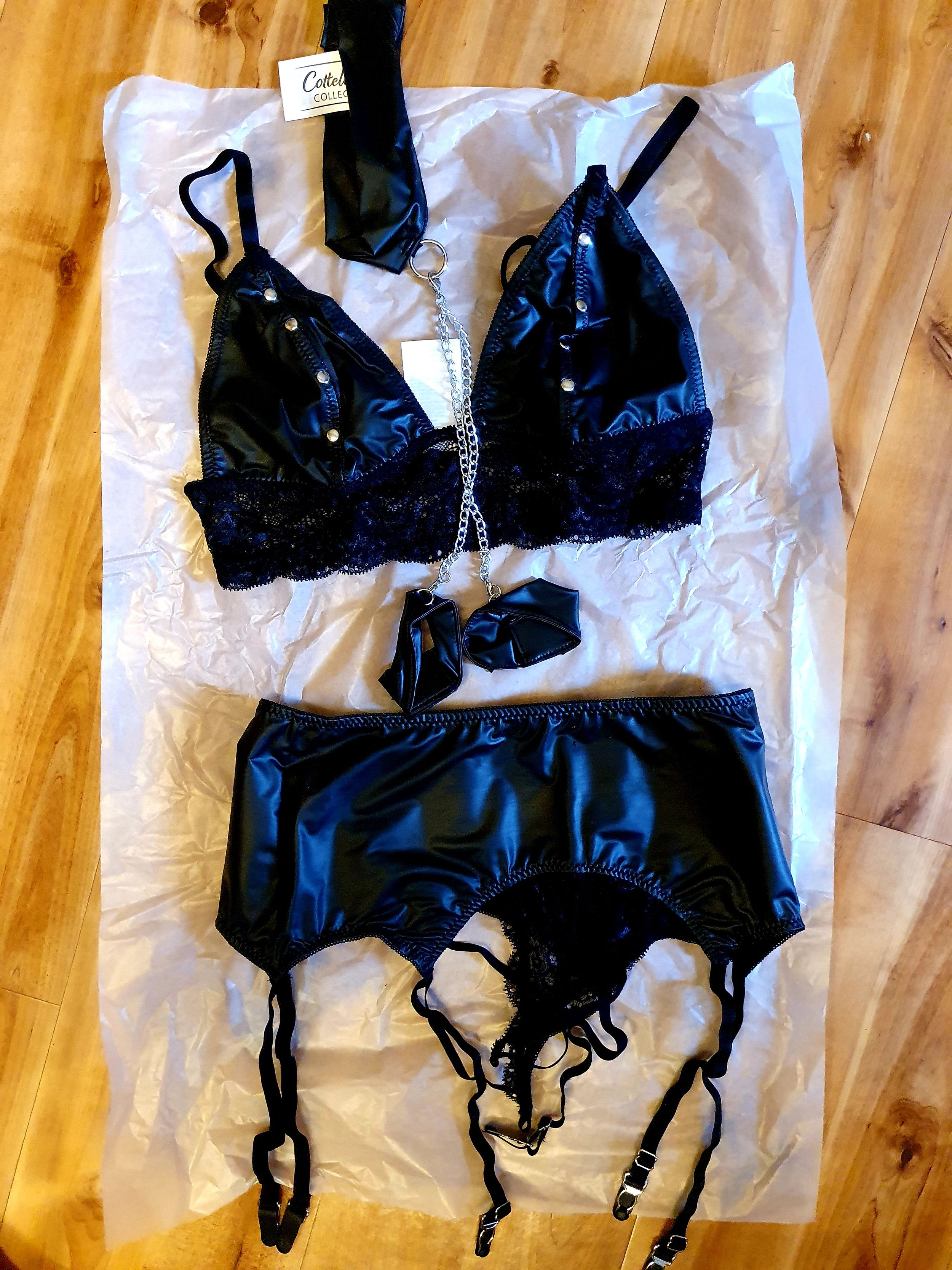 De set bestaat uit halsband met bindlussen (die losgemaakt kunnen worden van de halsband), een soepele bh (ook bruikbaar los van de set), en een jarretellen string set. De kousen zijn exclusief.