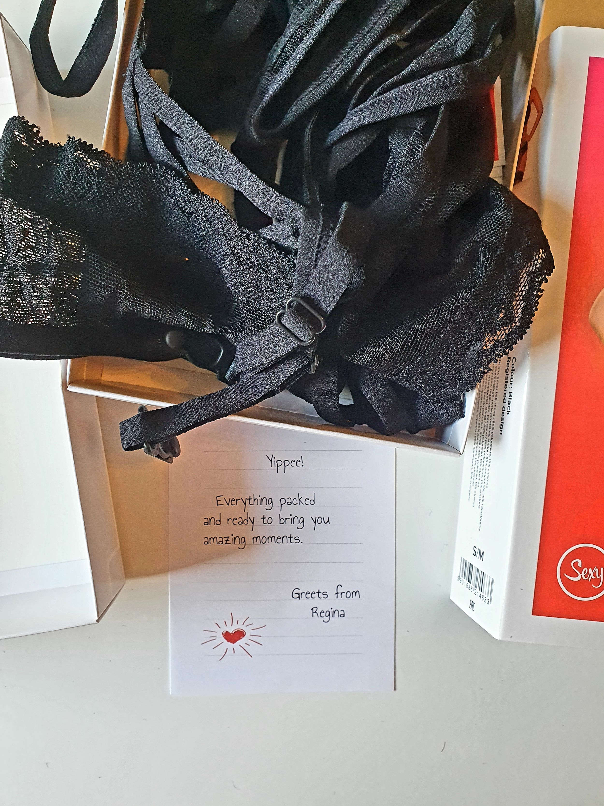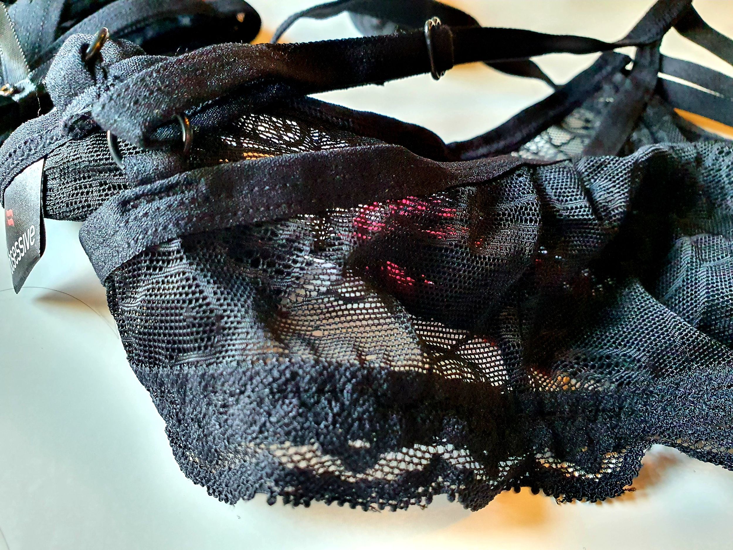 De zwart kanten en doorschijnende, zachte stukken lingerie doen me meteen tintelen van opwinding. Het is driedelig: bh, string en jarretelbroek (die je over de string heen aandoet). Het is vlot om aan (en uit) te doen, en zit als gegoten. De lingerie past zich mooi aan mijn lichaam aan.
