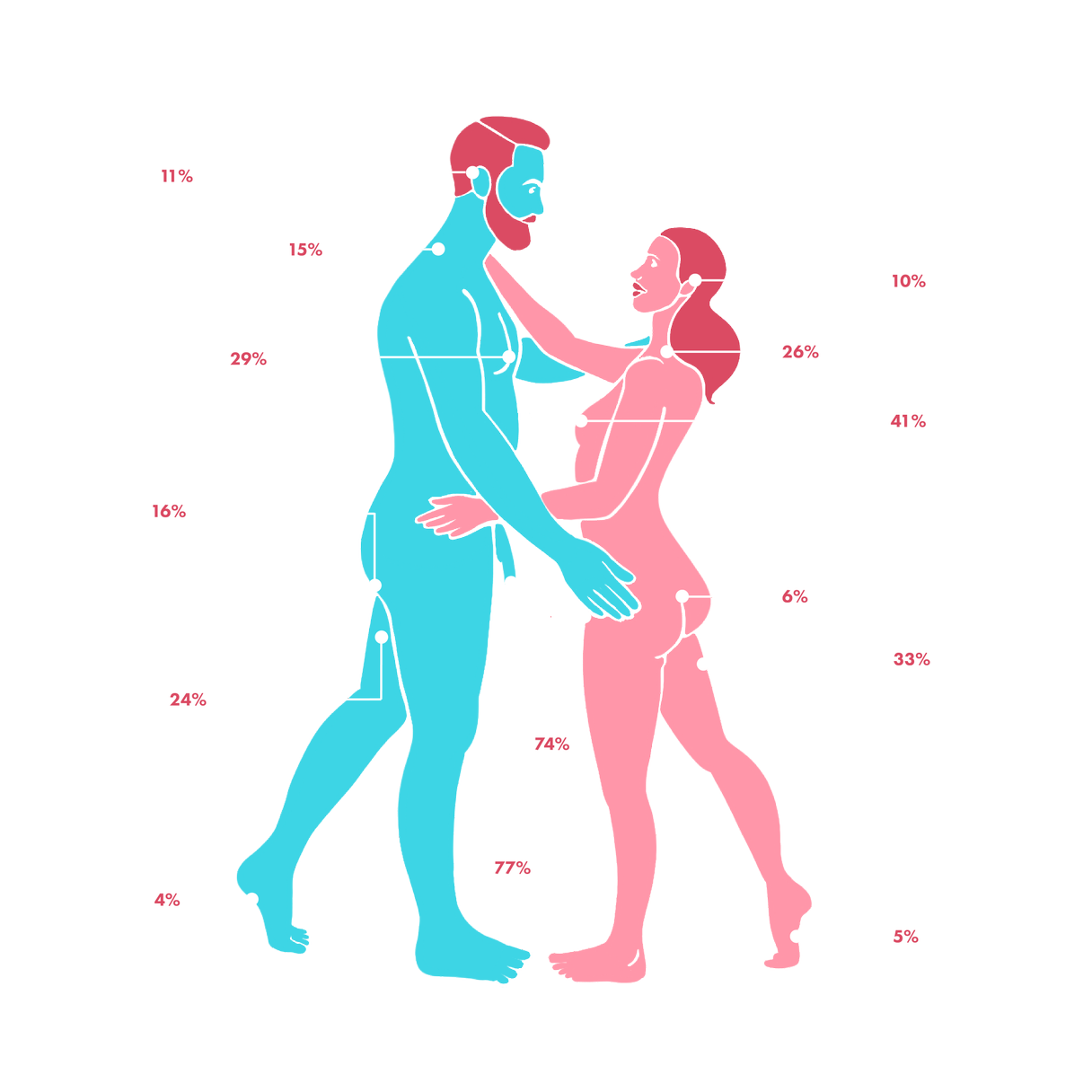 Natuurlijk zijn de geslachtsorganen bij zowel mannen als vrouwen favoriet, maar opvallend vonden wij dat mannen meer geïnteresseerd zijn in de zone rond de anus dan vrouwen.