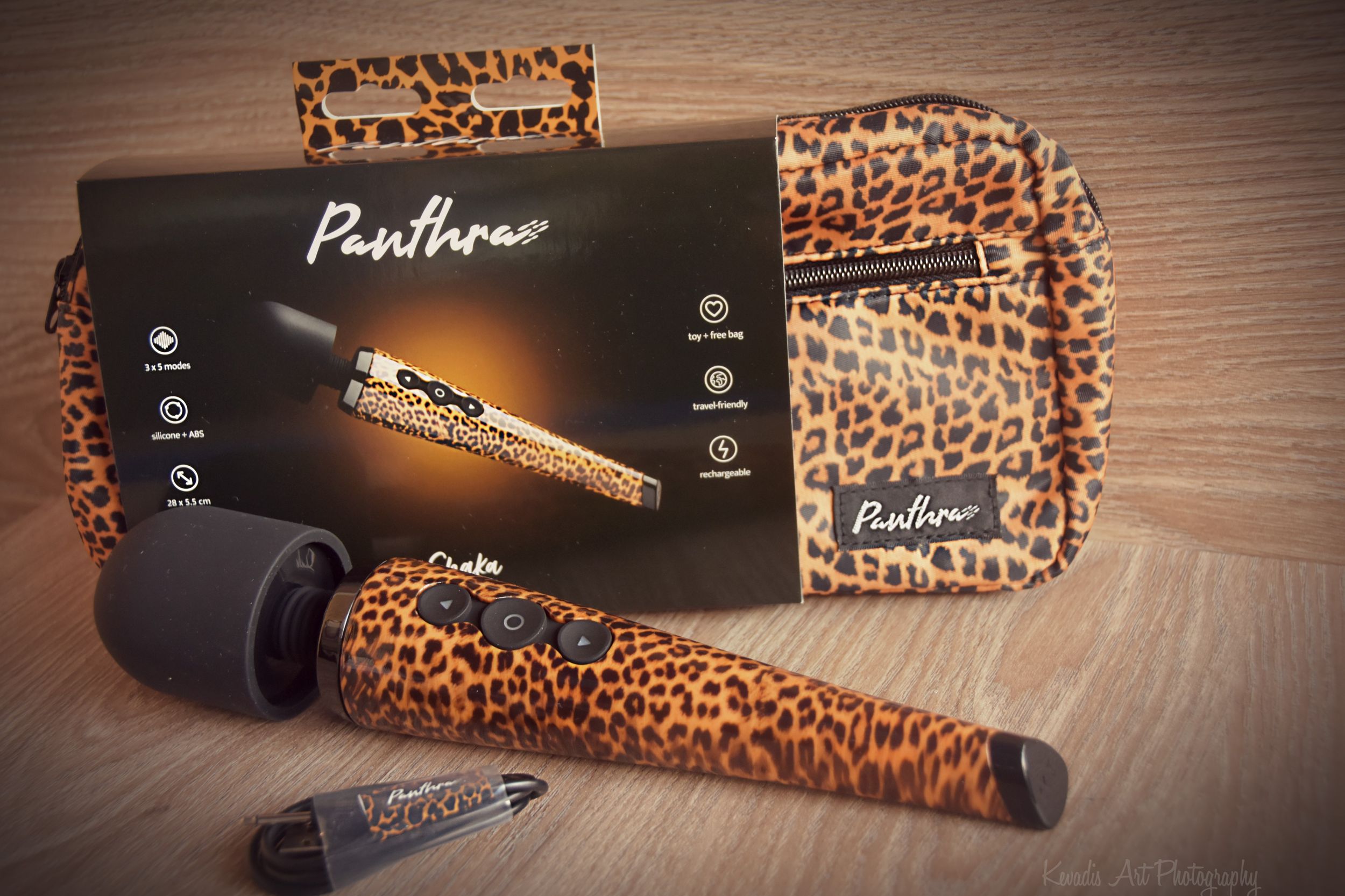 De wand vibrator zit vepakt in een handig reistasje geheel in dezelfde gave stijl. Je hebt een groot vak en aan de buitenkant zit ook nog een kleiner vak waarin je bv glijmiddel kunt bewaren. Om het reistasje zit een sleeve met een afbeelding van de toys samen met een beknopte uitleg over het product. Een kleine, maar erg duidelijke handleiding ( in het Engels,Nederlands, Duits, Frans, Spaans, Italiaans en ook nog in iets wat Russisch blijkt te zijn) is te vinden in het tasje zelf. De magische toverstaf ( want ja dat is het echt naar mijn idee) doet het meteen, maar ze raden in de gebruiksaanwijzing aan om hem voor het eerste gebruik volledig op te laden. De oplaadkabel vind ik top! Er zit namelijk een Panthra label aan waardoor je direct ziet dat die bij deze specifieke toy hoort ( waarom is dit eigenlijk niet de norm bij alle toys?. Opladen duurde niet té lang en is duidelijk. Het lampje knippert en blijft branden als “ie” volledig opgeladen is. Na opladen is de power merkbaar veel sterker, dus zeker een aanrader netjes het boekje te volgen :P